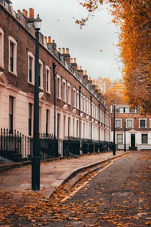 Falling leaves fly through the air in a classic London scene. Limited Edition, shot in Southwark, November 2023
