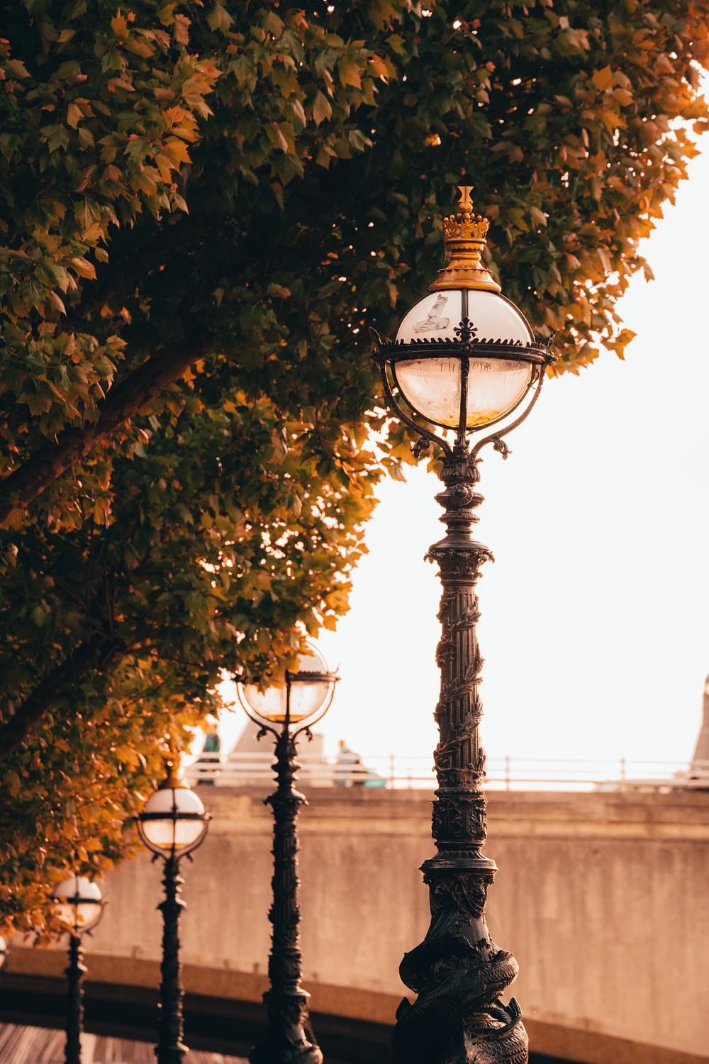 Marching into the distance near Waterloo Bridge, london's iconic lampposts glow in the sun Shot in London June 2025