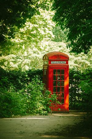 An iconic London telephone box bathed in sunlight and surrounded by jungle like leafs. Shot in London in May 2025