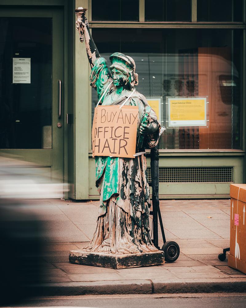 Street photography shot in London, Lady Liberty glares at oncoming traffic, weather worn and wearing a cardboard sign Shot in February in London.