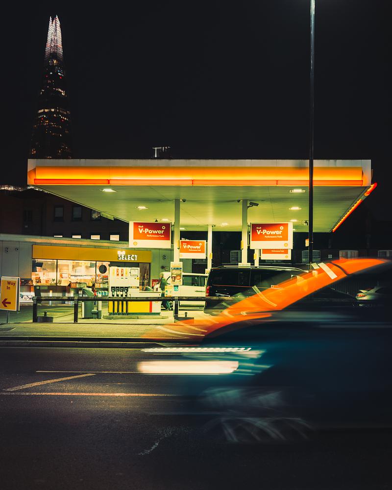 Whether in the heart of a city, or on a lonely road - there is something uniquely comforting about the sickly green glow of a gas station in the night. Shot in London in 2023
